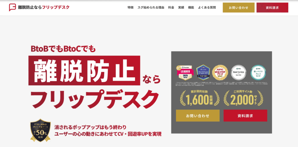 フリップデスクは、ユーザーが離脱する直前ではなく、訪問のタイミングに合わせて最適な案内を表示できるWeb接客ツールです。行動データをもとに、よくある質問や特集ページの案内などを柔軟に出し分けることで、購入までの流れを自然に形づくるアプローチが可能です。