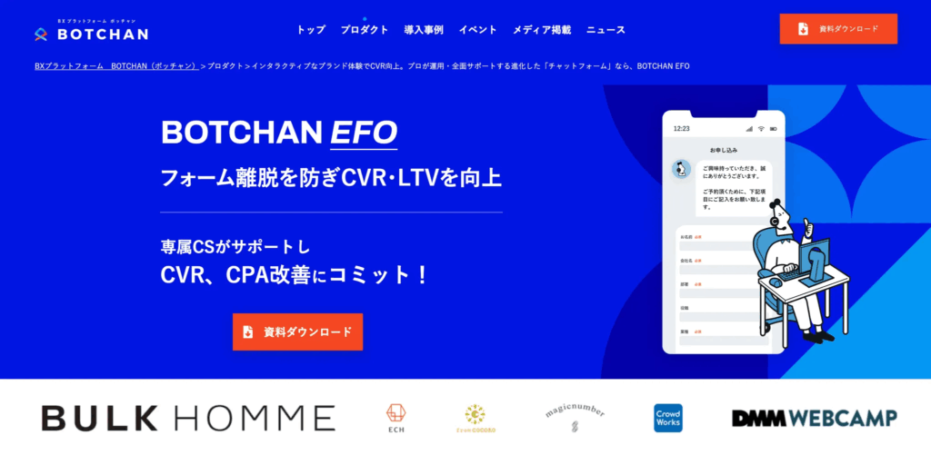 BOTCHAN EFOは、一問一答の会話形式でフォーム内容の入力を進められる“チャット型EFO”ツールです。従来のフォーム画面とは異なり、質問に答えるような流れで必要な情報を入力できるため、フォーム入力が苦手なユーザーでも負担を感じにくい点が特長です。