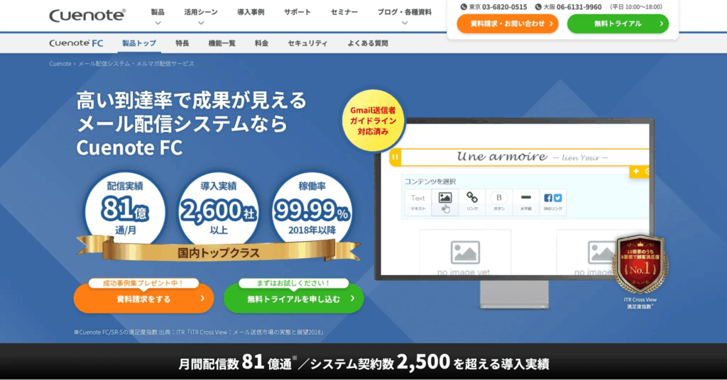 Cuenote FCは、メール配信に特化したカゴ落ち対策サービスです。高速かつ確実にメールを届ける仕組みを備えており、大量配信にも強い配信エンジンが搭載されています。