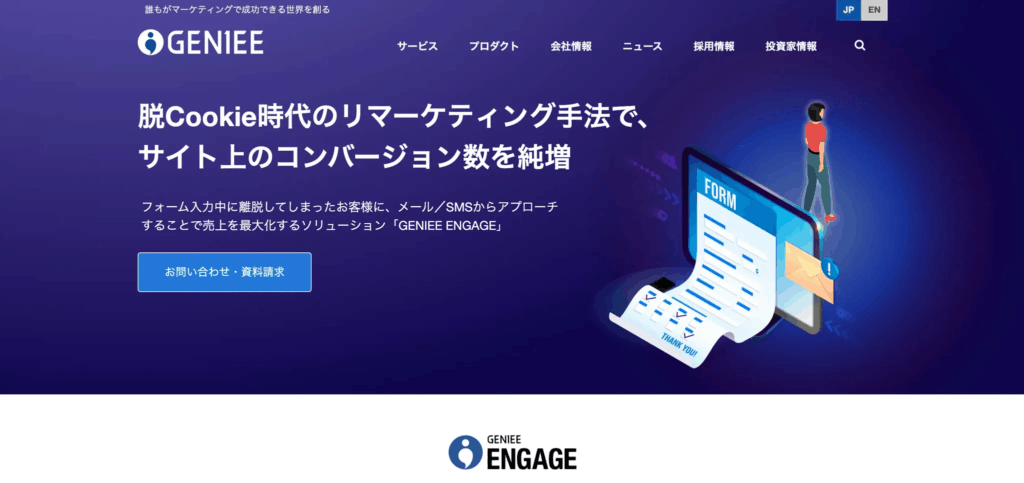 GENIEE ENGAGEは、メールとSMSの2つのチャネルを活用して、離脱後のユーザーにリマインドを行えるサービスです。豊富な導入実績をもとにした各企業にとって最も効果の良い訴求を提案することで、効率的で効果の高いアプローチが可能です。
