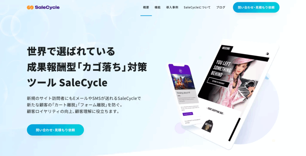 SaleCycleは、メールとSMSを活用して離脱後のユーザーにアプローチできるリマーケティングサービスです。本来情報取得がまだできていないはずの新規ユーザーに対してもメールとSMSの送付ができることが特長です。