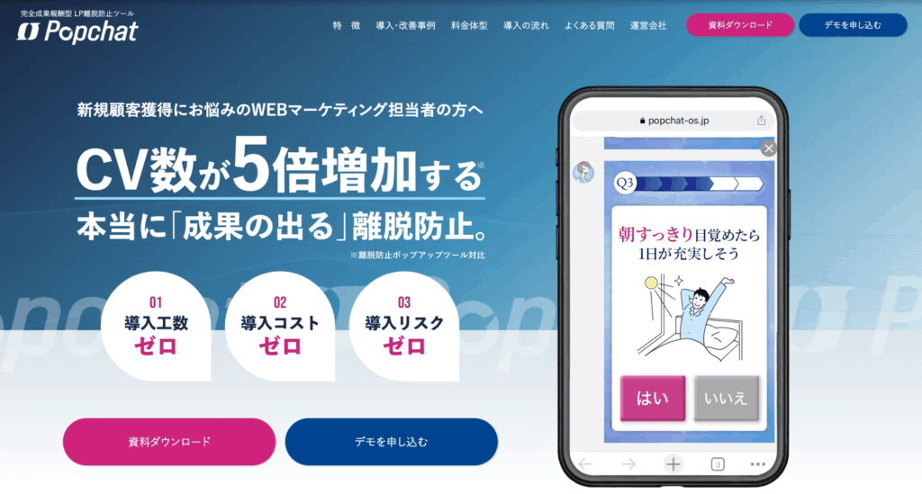 Popchatは、ポップアップとチャットの両方を活用して離脱後のユーザーにアプローチできるサービスです。豊富な支援実績をもとに、製品に適合したシナリオ設計及びPDCAを徹底し、改善にコミットします。