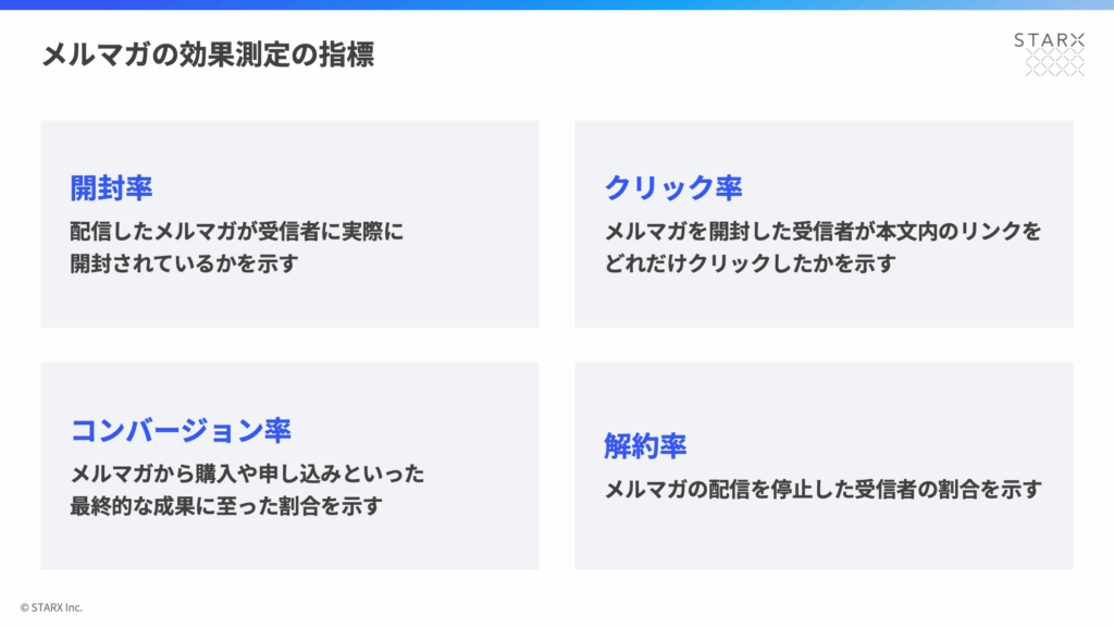 ここでは、メルマガの効果測定で特に重視される代表的な指標について整理します。それぞれの指標が何を示しているのか、どのような視点で確認すべきかを解説するとともに、一般的な目安となる数値についても紹介していきます。