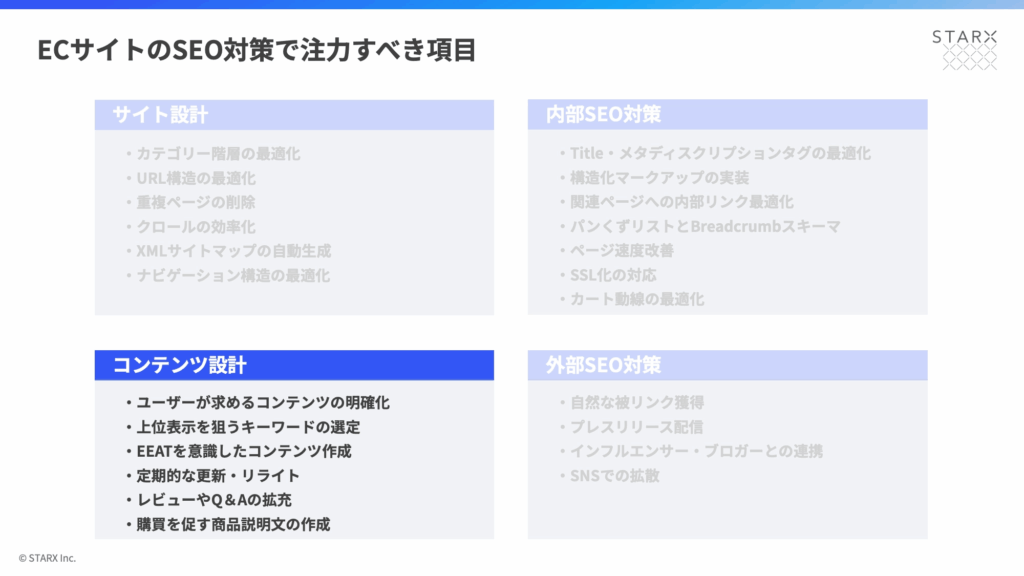 ここでは、ECサイトのSEOを考えるうえで押さえておきたいコンテンツ設計の具体的なポイントを6つに分けて整理します。