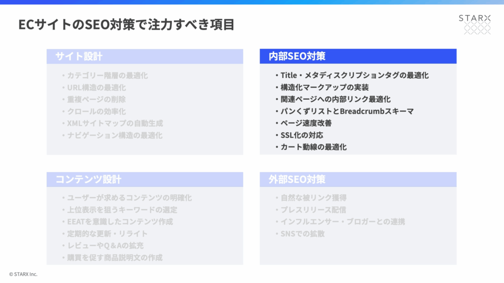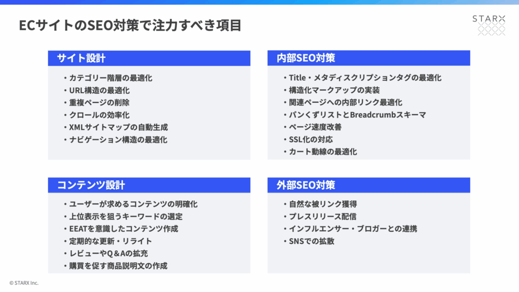 ECサイトのSEO対策は、大きく分けて以下の4つの領域に分類できます。