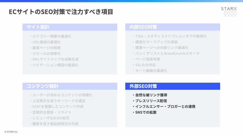 ここからは、ECサイトにおいて代表的な外部SEO対策を4つに分けて整理します。
