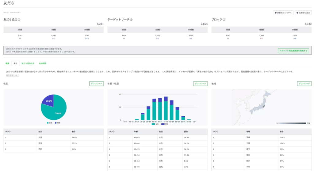 属性機能では、友だちの「性別」「年齢層」「居住地域」などのデータを確認できます。これはLINEが自動的に集計するもので、ユーザー全体の傾向を把握するのに便利です。例えば「20代女性の比率が高い」とわかれば、その層に合わせたキャンペーンを企画しやすくなります。