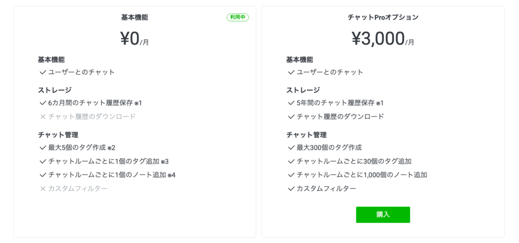 このような制限に対応する方法のひとつが月額3,000円で利用できる「チャットProオプション」の導入です。チャットProオプションを追加することで、作成できるタグは300個に増加し、チャットルームごとに30個のタグを付与することができます。また、保存期間についても5年間に増加することに加え、履歴のダウンロードが可能になるため、より多くの履歴を管理できるようになるといえます。