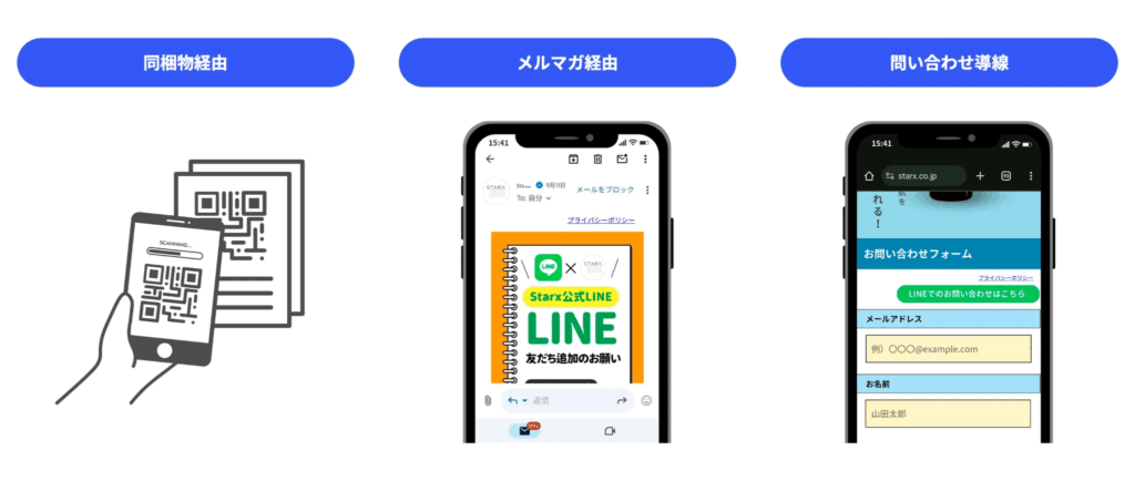 例えば、ユーザーが「同梱物に記載されたQRコードを読み取る」「メルマガ内のリンクをクリックする」「問い合わせフォームから登録する」といったさまざまな経路からLINEを経由してアクセスした場合でも、自動的に自社の会員情報や購買データと結びつけることが可能です。これにより、どの接点から流入したユーザーであっても、LINE上で一貫した顧客体験を提供できるのが大きな特長です。