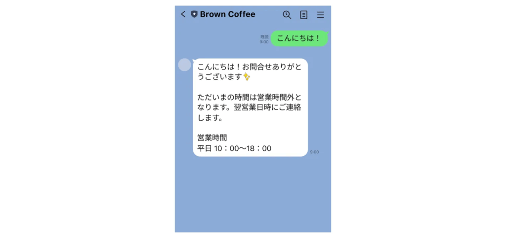 手動対応を効率的に行うためには、営業時間設定を活用するのも有効です。営業時間内は担当者が直接チャットに応答し、営業時間外は自動応答メッセージを送信するようにすれば、ユーザーは「無視されている」と感じることがありません。