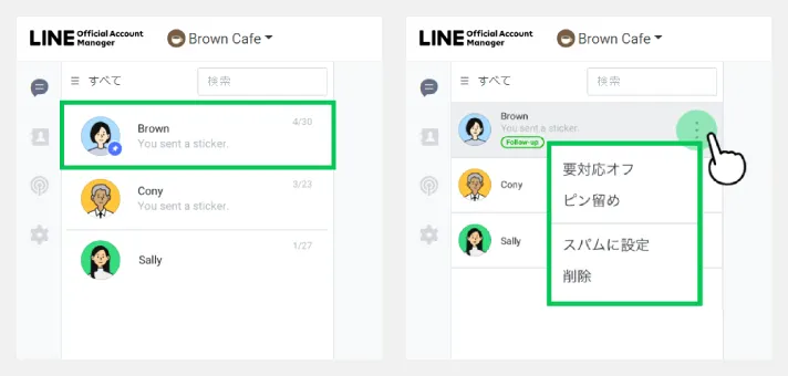 「ピン留め」機能を使えば、対応中や未返信のメッセージを上部に固定表示できるため、重要なやり取りを見逃さず対応可能です。加えて、「要対応」や「スパム」のラベルを設定すれば、優先順位付けや不適切なユーザー管理も容易になります。さらに、悪質なメッセージや不要な履歴については「削除」することもできるため、運用画面を常に整理された状態で保つことができます。